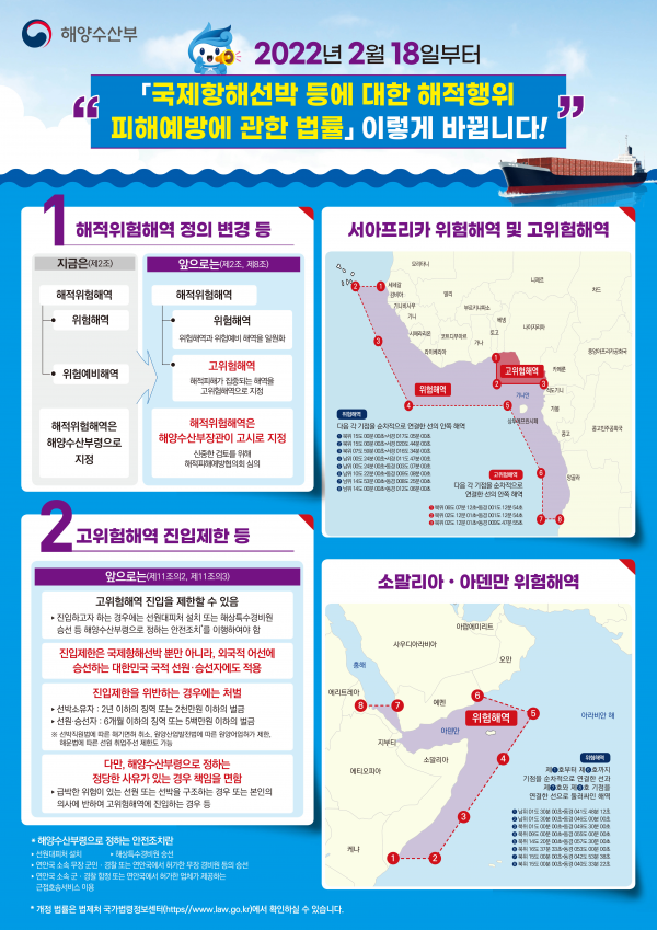 이에 해양수산부는 해적예방대책의 실효성을 제고하기 위해 안전조치를 강화하는 것을 주요 내용으로 지난해 8월 ‘해적피해예방법’을 개정했고 하위법령 개정 등 6개월 동안의 준비과정을 거쳐 2월 18일부터 ‘해적피해예방법’을 시행하게 됐다.