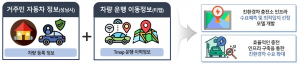 전기차, 수소차 등의 충전 시설 수요 예측과 최적 입지 분석 모델 개발에는 가명 처리된 성남시의 차량등록 정보와 티맵모빌리티의 차량 운행 이동정보가 활용된다.