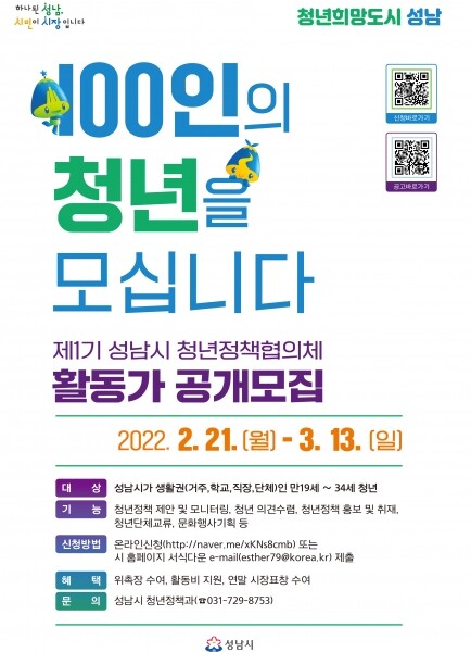 성남시 청년정책과 관계자는 “청년정책의 주체인 청년들이 다양한 의견을 내 젊은 세대에 필요한 정책을 발굴·추진하게 될 것”이라고 말했다.