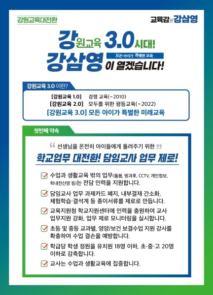 한편 강 예비후보는 이번 ‘학교업무 대전환’을 시작으로 ‘강원교육3.0’이라는 브랜드의 핵심 정책을 일주일에 한 번씩 발표한다는 계획이라고 전했다.