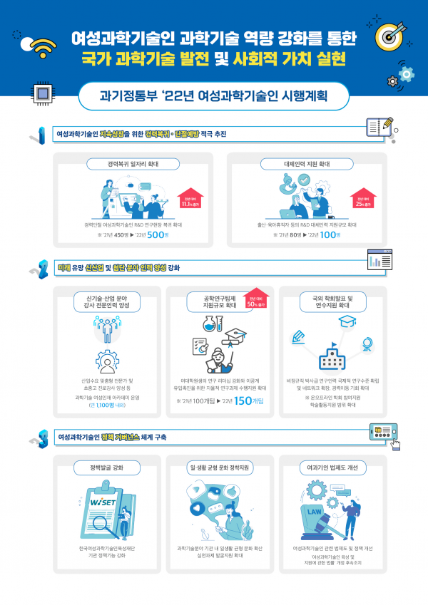 또한, 여성과학기술인 지속 성장을 위해서 경력복귀 일자리와 대체인력 지원을 확대하는 등 여성과학기술인 연구개발 분야 경력복귀와 경력단절 예방을 적극적으로 추진한다.