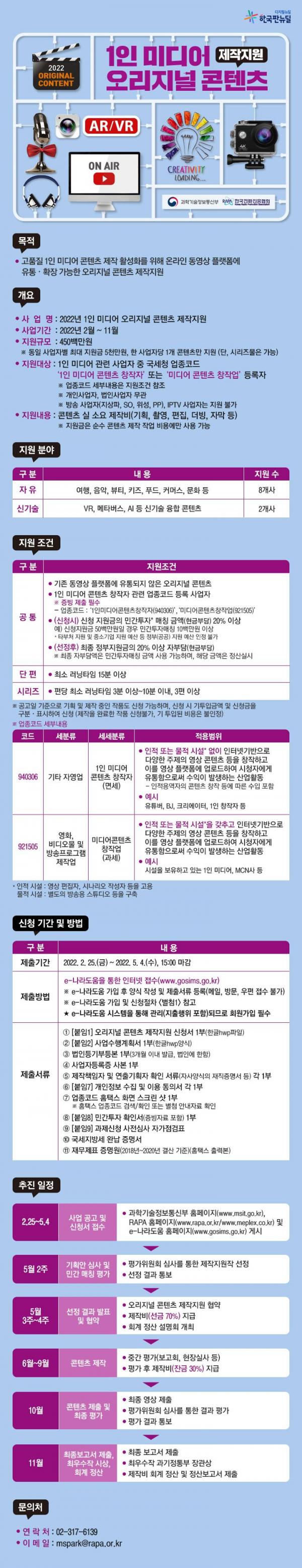 위 사업들 중 올해 가장 먼저 시작하는 1인 미디어 ‘오리지널 콘텐츠’ 제작지원은 오늘부터 공고하며 5월4일까지 신청을 접수받는다.