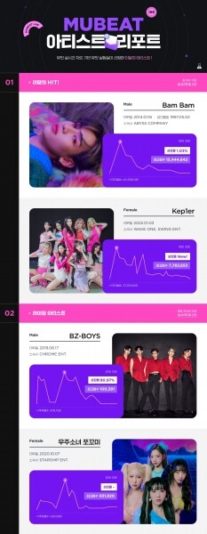 뮤빗 팬덤실험실의 아티스트 리포트는 한 달간 집계된 뮤빗 내 데이터를 바탕으로 매월 발간되는 아티스트 보고서로 매달 가장 우수한 성과를 거둔 아티스트를 선정하는 ‘이달의 HIT’ 부문과 주목할 만한 성과를 보여준 ‘라이징 아티스트’부문으로 구성됐다.