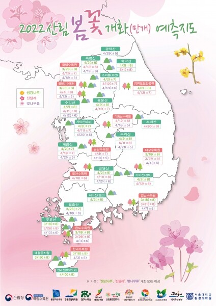 올해 산림 봄꽃의 절정은 종별로 다소 차이는 있겠지만 대체로 3월 중순 시작될 예정이며 특히 남부에서 중부지역으로 점차 확대되었던 과거와 달리 제주도와 전라남도를 제외한 전국에서 비슷한 시기에 절정을 맞이할 것으로 예측됐다.
