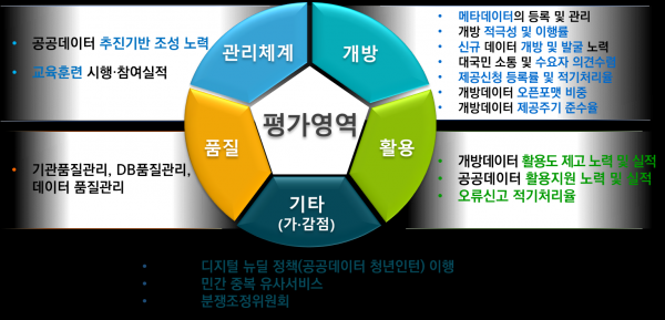 공공데이터 제공 운영실태는 공공데이터 개방, 활용, 품질, 관리체계, 기타 등 5개 영역의 16개 지표를 선정하고 2020년 10월부터 2021년 9월까지의 기관별 운영 실적을 평가했다.