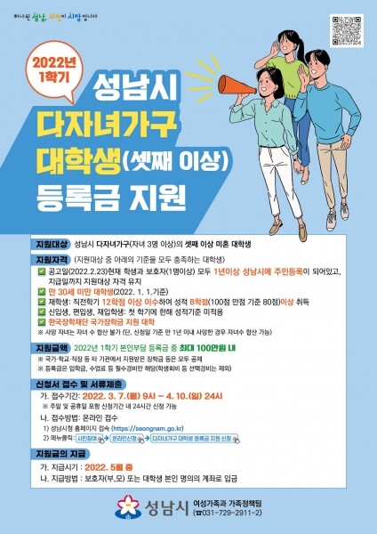 성남시 관계자는 “다자녀를 양육하는 부모의 대학 교육비 부담을 덜어주려고 올해 처음 도입한 출산장려책”이며 “성남시는 다자녀가구 전세자금 대출이자 지원, 공영주차장 이용요금 감면, 양육수당과 안심보험 지원 등 다자녀가구 지원책을 다각화하고 있다”고 말했다.