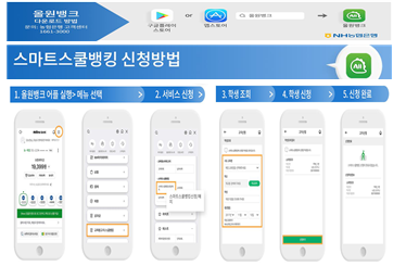 스마트스쿨뱅킹 서비스는 농협은행의 올원뱅크 앱을 통해 이용 가능하며 특히 교육비 납부에 대한 고지 기능이 추가되어 언제든지 고지 내용 및 납부 내역을 확인할 수 있고 오픈뱅킹 적용으로 농협계좌뿐 아니라 학부모가 원하는 계좌로 납부가 가능하도록 해 사용자의 편의를 높였다.