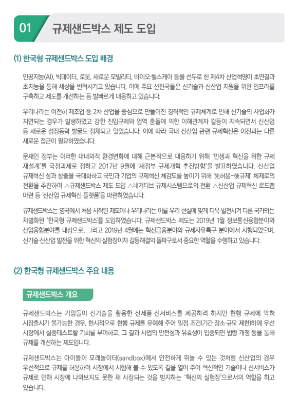 ‘규제샌드박스 백서’는 ‘한국형 규제샌드박스’ 제도의 내용 및 발전과정과 지난 3년간 달성한 성과를 정리하고 주요 승인기업들의 사례를 공유함으로써 규제샌드박스에 대한 국민과 기업들의 이해를 돕고 신산업·신기술 규제혁신을 더욱 가속화하기 위해 발간했다.