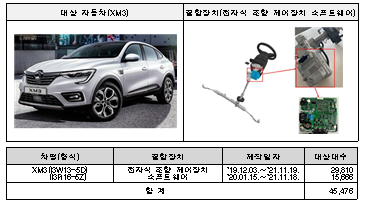 첫째, 르노삼성자동차㈜에서 제작, 판매한 XM3 45,476대는 전자식 조향 제어장치의 소프트웨어 오류로 특정상황에서 제어장치 회로기판에 열 손상이 발생하고 이로 인해 조향핸들이 무거워져 안전에 지장을 줄 가능성이 확인되어 시정조치에 들어간다.