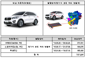 첫째, 현대자동차·기아㈜에서 제작, 판매한 투싼, 쏘렌토 등 3개 차종 727,226대는 전기식 보조 히터 연결부의 내열성 부족으로 온도가 과도하게 증가 시 연결부 및 전기배선 손상으로 인해 화재가 발생할 가능성이 확인되어 자발적으로 시정조치에 들어간다.