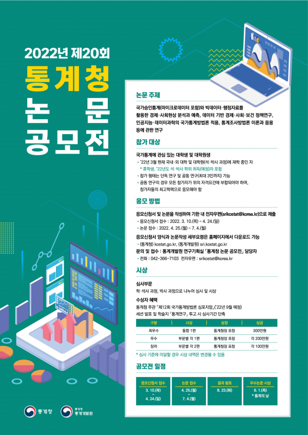이번 논문 공모전을 주관하는 통계개발원의 전영일 원장은 “나라와 세계를 이끄는 데이터 혁신 연구는 청년 때 그 빛을 발휘한다”며 “특히 인공지능을 활용한 난제해결, 빅데이터·행정자료의 연계 데이터를 활용한 증거기반정책, 개인정보보호를 도약시키는 혁신적 통계기법을 제시하는 신선한 논문들을 기대한다”며 공모전의 적극적인 참여를 당부했다.