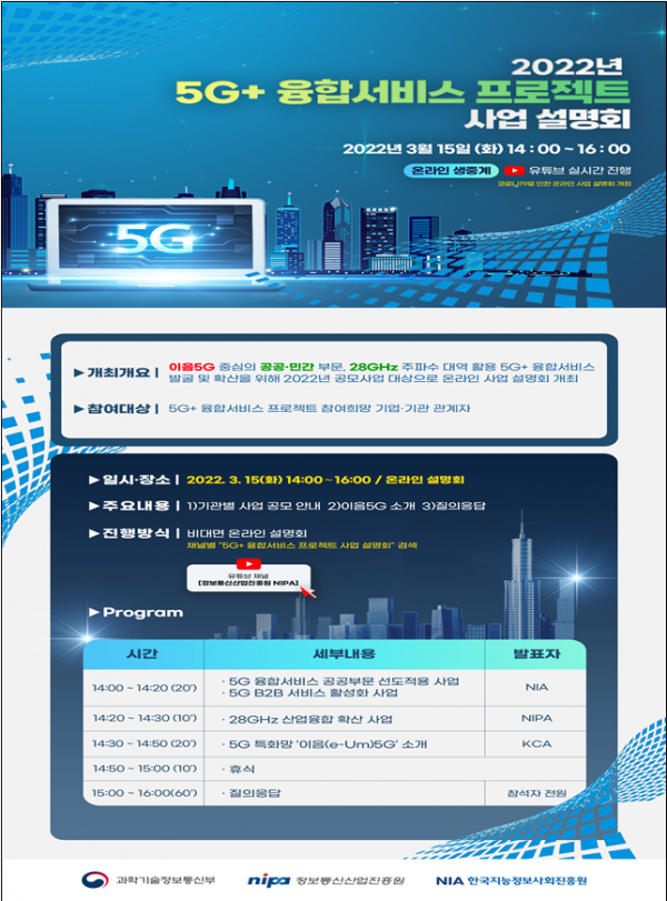5세대+ 융합서비스 프로젝트 사업은 3월 15일 사업 설명회 개최 후 본 공고를 진행할 예정이다.