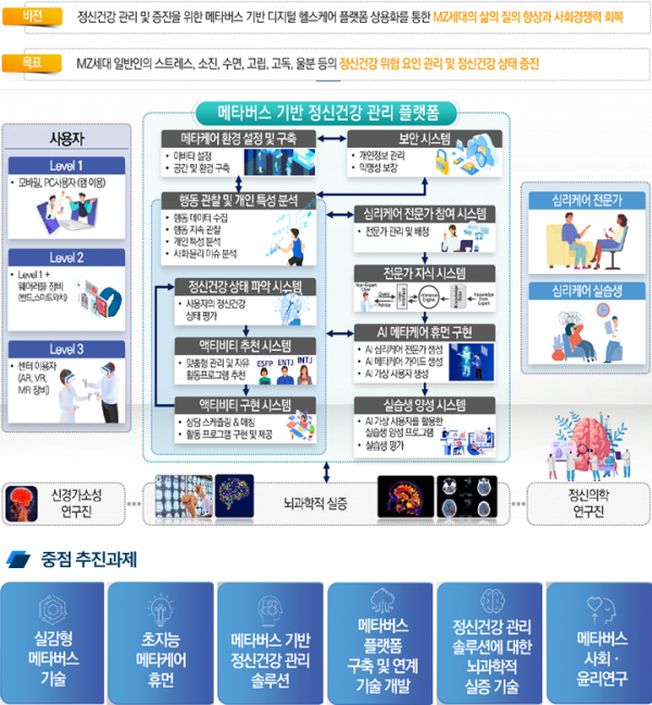실감형 메타버스를 구축하고 메타버스에서 활용할 수 있는 메타케어 휴먼기술 및 정신건강관리 솔루션을 개발해 정신건강관리에 효과적인 프로그램을 개발할 예정이며 향후 개발된 프로그램을 기존 심리지원 프로그램과 연계하고 공공서비스에 활용하면 정신건강 문제로 인한 사회경제적 손실을 최소화할 수 있을 것으로 기대된다.
