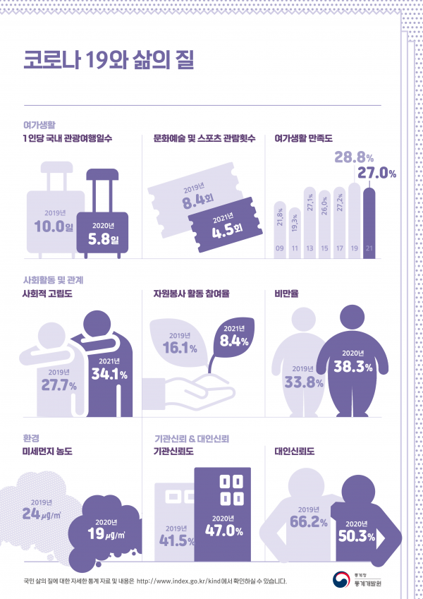 또한 “코로나19로 인한 지난 2년간 우리 국민의 삶의 질 변화를 종합적으로 진단하는 보고서”며 “코로나 이후 사회를 준비하는 데이터 나침반으로서 궁극적으로는 국민의 삶의 질 증진에 기여할 수 있기를 바란다”고 전했다.