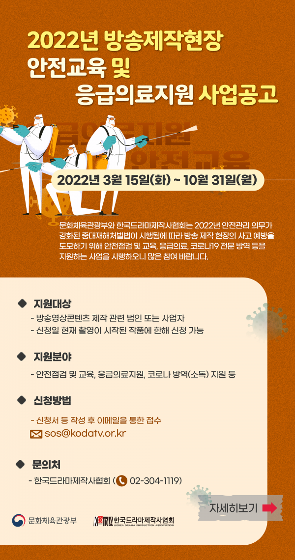‘2022년 방송제작 현장 안전교육 및 응급의료 지원 사업’은 제작사를 대상으로 지원 신청을 받으며 이 사업에 참여하는 제작사들은 폭발·추락·화재·붕괴 장면 등 사고 발생 위험이 있는 촬영현장에 응급구조사와 응급구조 차량을 지원받을 수 있다.