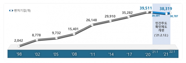 벤처기업수는 벤처기업법에 따른 확인제도가 시행된 ‘98년 2,042개사에서 제도 개편 전인 ’20년 말에는 39,511개사까지 지속적으로 성장해 ‘제2벤처열기 조성’ 등 벤처생태계의 기반을 형성했다.