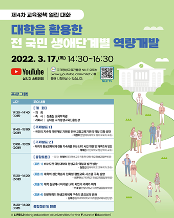 이번 제4차 대화에서는 ‘대학을 활용한 전 국민 생애단계별 역량개발’을 주제로 교육 전문가, 대학 관계자, 정책수요자 등이 온오프라인을 통해 대학 평생교육 정책의 발전 방향에 대해 논의한다.