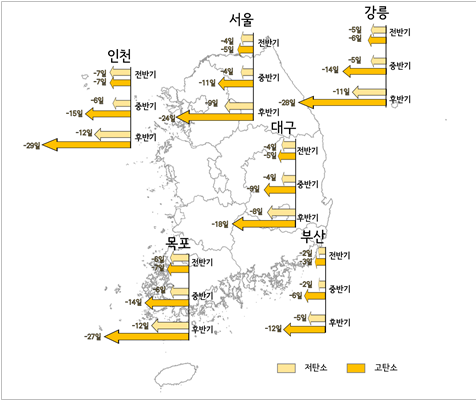 지역에 따른 차이도 나타나, 벚꽃의 경우, 21세기 후반기, 고탄소 시나리오에서 개화일이 대구 30일로 가장 많이 당겨지고 서울’강릉’부산 순으로 각각 27일 26일 24일 당겨질 전망이다.