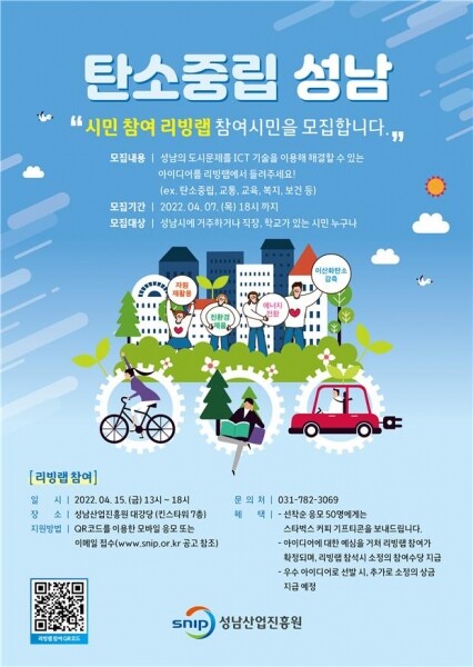 성남시와 성남산업진흥원은 매년 ‘시민참여 리빙랩’을 개최하고 있으며 도시문제를 해결할 수 있는 아이디어를 시민들로부터 제안받고 성남시 기업은 ICT기술을 통한 솔루션을 제공해 시민과 기업이 힘을 합쳐 지역의 문제를 해결하는 사업으로써 올해는 높아지는 기후/환경 분야를 중심으로 ‘탄소중립’을 메인 슬로건으로 내세웠다.