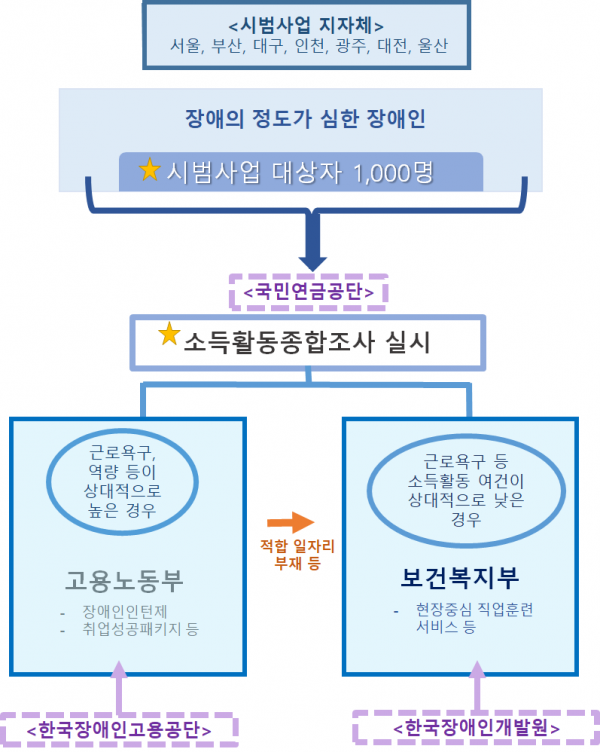 시범사업에 참여하는 중증장애인은 접수 순서에 따라 소득활동종합조사를 거쳐, 최대 6개월간 적합한 민간일자리 또는 현장 중심 직업훈련 서비스 등을 연계 받는다.