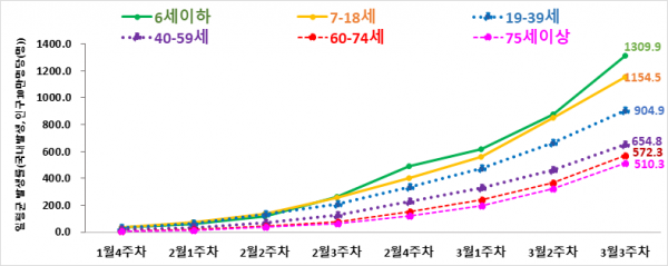 연령별 발생 현황은 모든 연령대에서 일평균 발생률이 전주 대비 1.3배 이상 증가했다.
