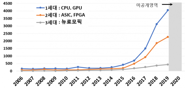 전 세계적으로 인공지능 반도체 특허신청은 최근 3배 이상 폭증했는데, 이러한 증가세는 ’16년 알파고와 이세돌의 대국 이후 인공지능에 대한 국제적 관심 및 개발붐에 따른 것으로 보인다.
