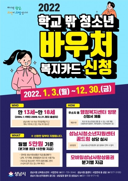 지급 대상 학교 밖 청소년은 신청일 기준 성남시에 1년 이상 주민등록을 두고 계속 거주하고 있는 2004년 1월 1일생부터 2009년 12월 31일까지의 출생자다신청하려면 주소지 동 행정복지센터에 정원외관리증명서 제적증명서 미진학증명서 등 입증서류를 내면 된다.
