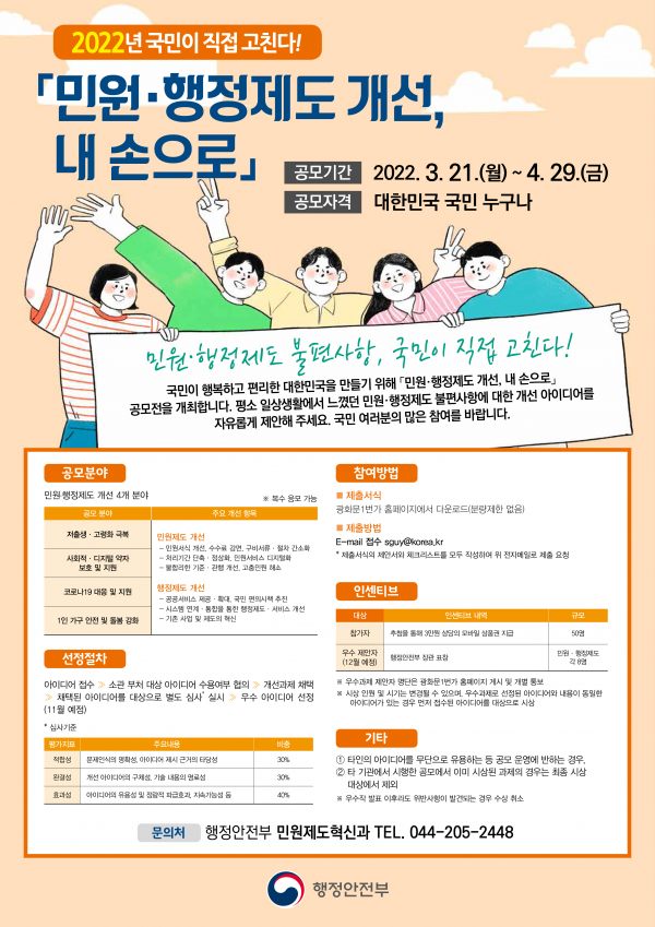 아울러 ‘‘2022년 민원·행정제도 개선, 내손으로’ 공모전’을 통해, 국민이 생활 속에서 겪은 불편 민원 및 행정 전반에 대한 개선의견을 직접 제안할 수 있다.