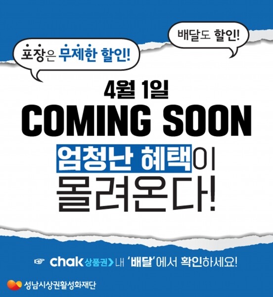 시 출연기관인 성남시상권활성화재단이 오는 4월 1일부터 성남사랑상품권 통합플랫폼인 ‘착’ 앱을 통해 2만원 이상 배달 주문 또는 매장 포장 주문을 하는 이들에 7000원의 모바일 할인 쿠폰을 제공하는 방식이다.
