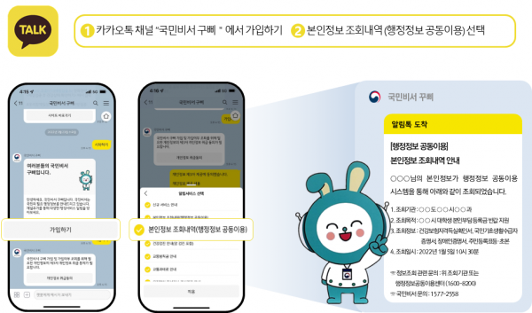 행정정보 공동이용 과정에서 본인의 행정정보가 조회되면 국민비서 ‘본인정보 조회내역 알림’을 신청한 국민을 대상으로 즉시 민원인명, 조회기관, 조회목적, 조회정보, 조회일시가 안내된다.