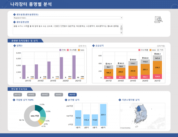 이번 시각화서비스는 나라장터에 물품을 공급하고자하는 조달업체 및 관련 협회, 연구기관 등이 해당물품의 공공조달시장 규모 및 경쟁현황 등을 파악하는데 큰 도움이 될 것으로 예상된다.