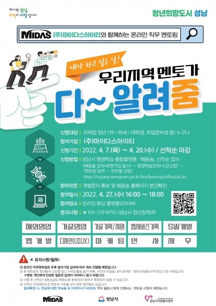멘토링 행사에 참여하려는 대학생, 취업 준비생 등 만 19~39세의 미취업 청년은 오는 4월 20일까지 성남시 평생학습 포털 배움숲을 통해 선착순 신청하면 된다.