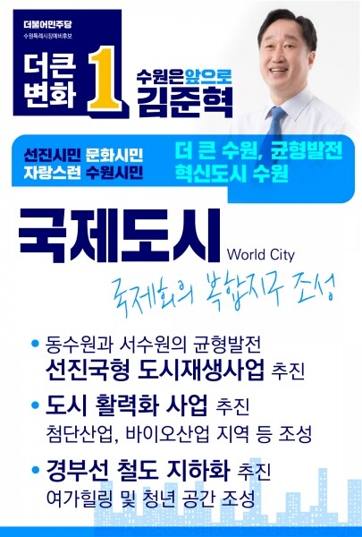 한편 자타공인 정조전문가, 수원전문가로 불리는 김준혁 예비후보는 현재 유력한 수원특례시장 후보로 거론되고 있으며 김상회, 김희겸, 이재준, 이기우, 이필근, 조석환, 장현국 , 조명자 등과 함께 당내 경선을 위해 경쟁중이다.