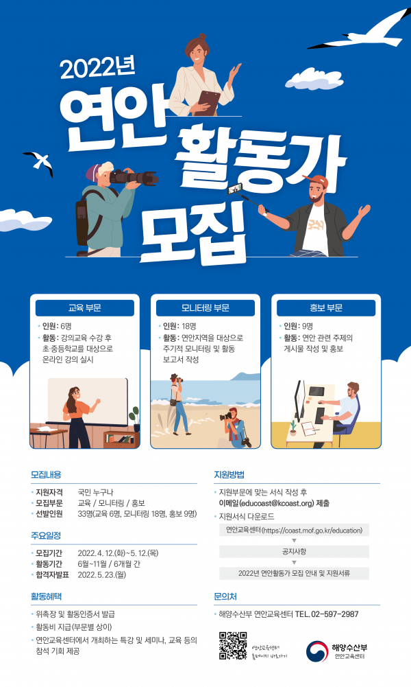 ??이번 연안활동가 모집은 국민이 직접 연안관리에 지속적으로 참여할 수 있도록 분야별 활동가를 양성하는 프로그램으로 교육·지역 모니터링·홍보 등 세 개 부문에서 총 33명을 선발해 약 6개월 동안 온·오프라인 활동을 수행할 예정이다.