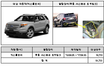 첫째, 포드세일즈서비스코리아에서 수입, 판매한 익스플로러 19,733대는 뒷바퀴 현가장치 내 일부 부품이 내구성 부족으로 파손되고 이로 인해 주행 중 조향이 정상적으로 되지 않아 안전에 지장을 줄 가능성이 확인되어 자발적으로 시정조치에 들어간다.