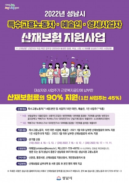 대상자는 산재보험료 지원신청서 본인 명의 통장 사본 등의 서류를 성남시청 고용노동과 이메일이나 팩스, 등기우편으로 보내면 된다.