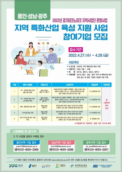 이 사업은 지난 2013년부터 경기도 남동부 지역 내 유망 중소기업과 스타트업을 지원하기 위해 시와 경기도, 성남시, 광주시, 경기테크노파크, 단국대학교가 함께 추진하는 사업이다.
