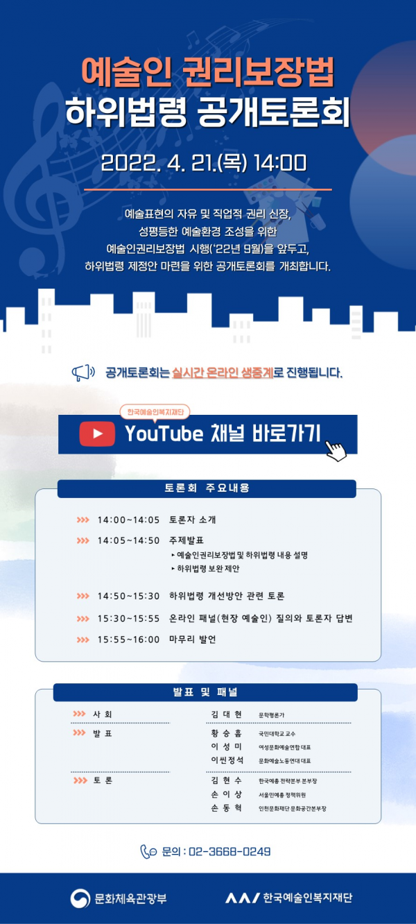 이번 공개토론회에서는 문체부가 제정하고 있는 ‘예술인권리보장법’ 시행령 및 시행규칙에 대한 문화예술계 현장 관계자의 의견을 수렴한다.