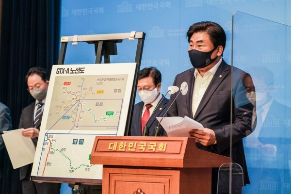 경기·강원·충청·경상권 여·야 국회의원은 20일 국회 소통관에서 기자회견을 열고 대선 공통공약인 GTX A·B 노선 연장 및 중앙선 연결을 촉구했다.