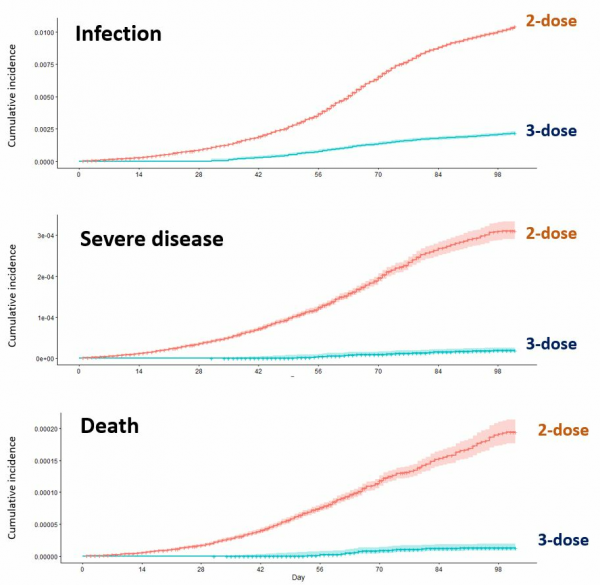 이번 논문은 국내 거주 60대 이상 연령층 약 1천 1백만명을 대상으로 2021년 10월부터 ~ 2022년 1월까지 코로나19 백신 2차접종 완료군과 3차접종 완료군에서 코로나19 감염, 위중증, 치명률을 분석한 결과로 2차접종만 완료한 군에 비해 3차접종완료군에서 감염 예방효과는 75.0%, 위중증 예방효과는 91.6%, 사망 예방효과는 92.3%로 분석됐다.