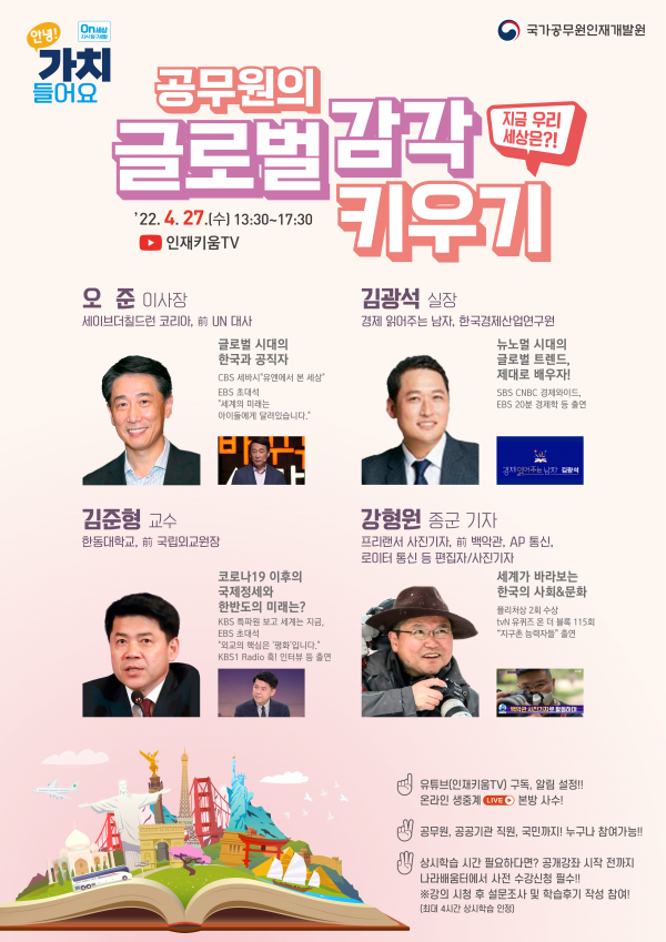 국가공무원인재개발원은 27일 '제4회 온세상 지식탐구생활, 안녕 가치 들어요' 공개강좌를 개최한다.