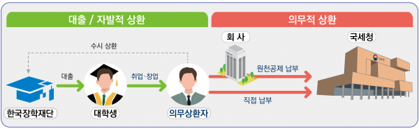 근무 중인 회사에서 매월 급여 지급 시 의무상환액의 1/12씩을 원천공제하는 방식으로 상환할 수 있다.
