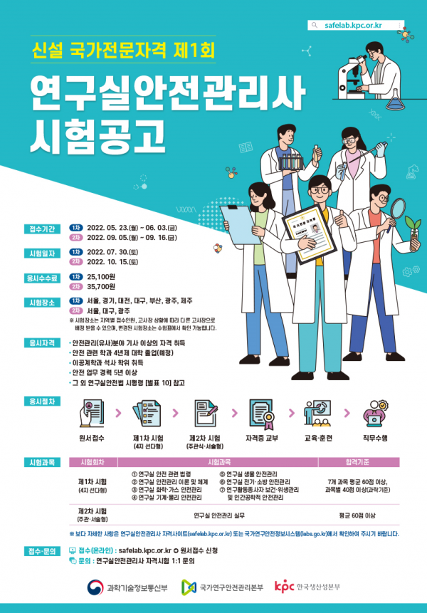 제1회 연구실안전관리사 자격시험의 1차 필기시험은 오는 7월 30일에 실시될 예정이며 시험 접수는 5월 23일부터 6월 3일까지 별도의 온라인 시스템을 통해 이루어진다.
