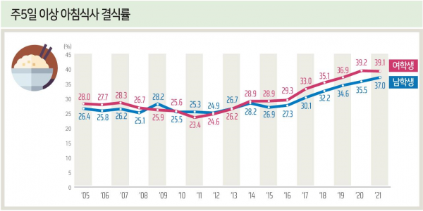 주5일 이상 아침식사 결식률은 ‘21년 38.0%로 지속 증가 경향이며 일1회 이상 과일섭취율은 ’21년 18.1%로 지속 감소했다.