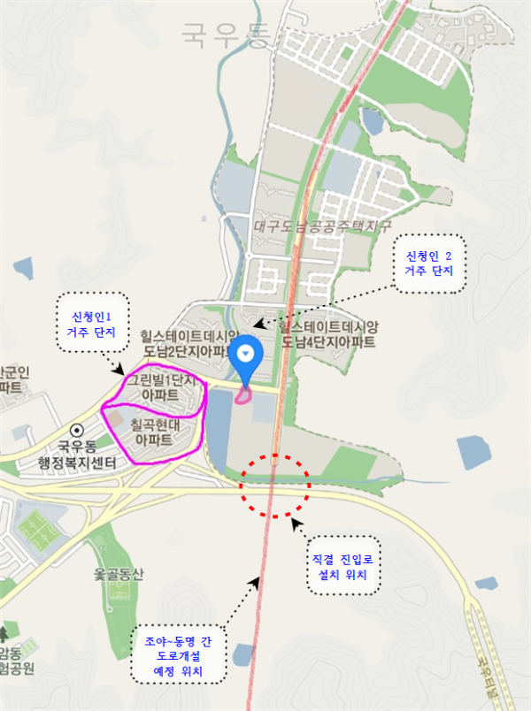대신 주택지구로의 진출입로는 인근 아파트인 그린빌 아파트와 칠곡 현대 아파트 정문의 기존 도로를 지나 설치하는 것으로 결정됐다.