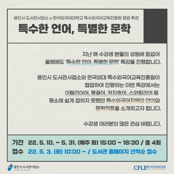 시 도서관사업소 관계자는 “지난해 진행했던 특강에 많은 시민들이 성원을 보내주셔서 올해도 준비하게 됐다”며 “세상에 모든 문학과 언어는 특별하다 다양한 외국어를 깊이 있게 들여다볼 수 있는 좋은 기회가 되길 바란다”고 말했다.