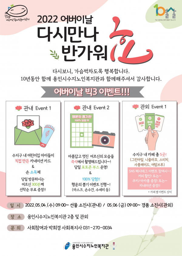 이번 기념행사는 오는 4일 수지구 내 어린이집 아동들이 직접 만든 카네이션 증정을 시작으로 소소한 이벤트를 통한 선물 증정 등 관내에서 진행되는 행사와 6일 수지구 내 카페 5곳과 연계한 할인 및 증정 이벤트 등 관외에서 진행되는 행사로 구분되어 다양한 볼거리와 즐길 거리를 제공할 예정이다.