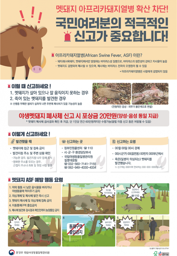 야생멧돼지 폐사체를 신고할 경우 포상금 20만원이 지급되며 국립야생동물질병관리원 및 전국민원콜센터를 통해 전국 지자체 시군 환경과에서 폐사체 신고를 받고 있다.