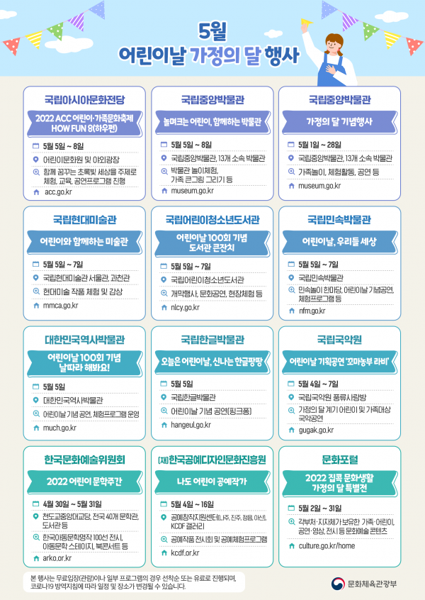 문체부 정책 담당자는 “오랜 코로나19 상황으로 문화생활에 어려움이 있었는데, 이번 가정의 달에는 완화된 방역지침에 따라 자녀와 부모가 문화예술 행사를 함께하며 ‘문화’로 행복해지는 오월의 날들을 보내길 바란다”고 밝혔다.