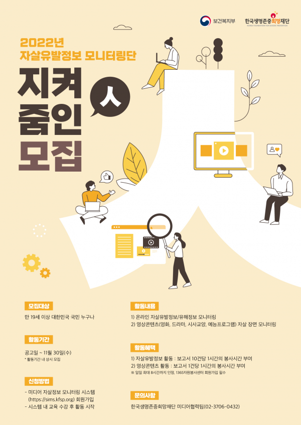 ‘지켜줌인’은 온라인상에서 무분별하게 유통되고 있는 자살 유발 정보 등을 감시하고 신고하는 자원봉사자이다.